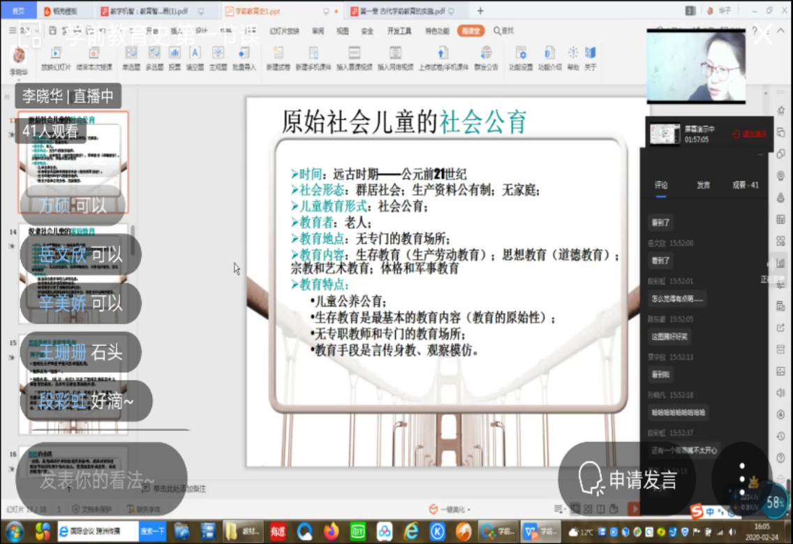 本学期我系共有5门课程列为第一批雨课堂在线授课。其中包括:王福兰老师的《发展心理学》(2019级)、郑玉飞老师的《课程论》(2018级)、侯佳老师的《教育经济学》(2018级)、张小丽老师的《教育学术史研究》(2017级)和李旭老师的《专业外语》(2017级)。经过开学一周的在线直播,开课老师们总体上有以下几点体会: